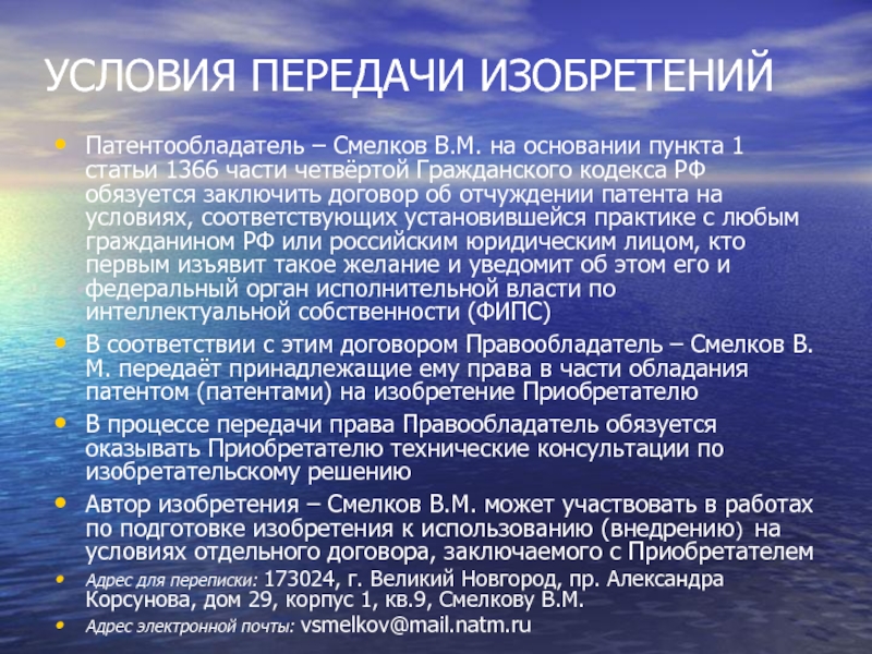 В соответствии с этим договором Правообладатель – Смелков В.М. передаёт принадлежащие ему права в части обладания патентом (патентами) на изобретение Приобретателю