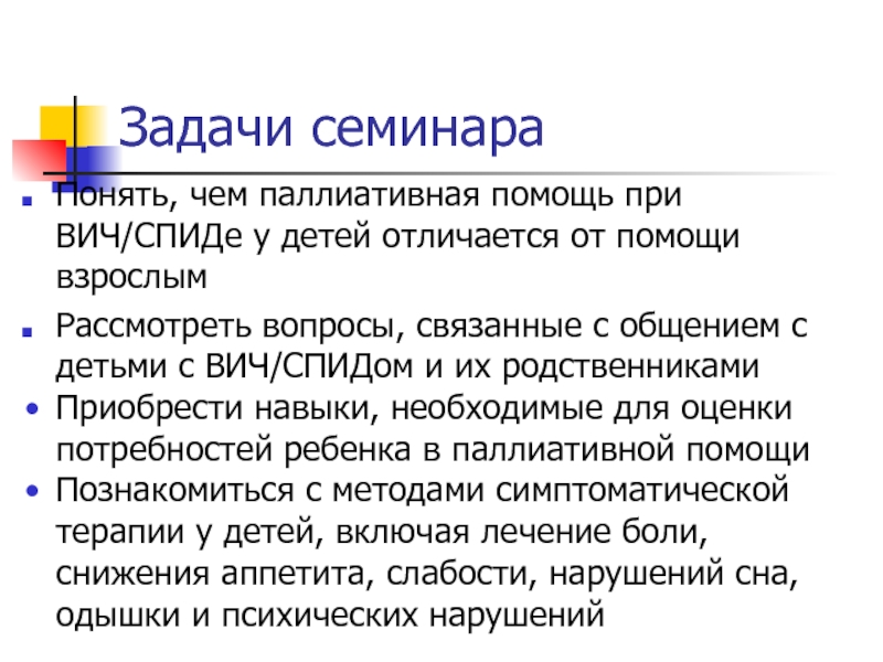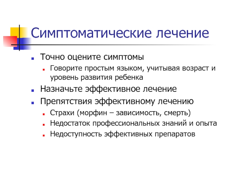 Познакомиться с методами симптоматической терапии у детей, включая лечение боли, снижения аппетита, слабости, нарушений сна, одышки и психических нарушений