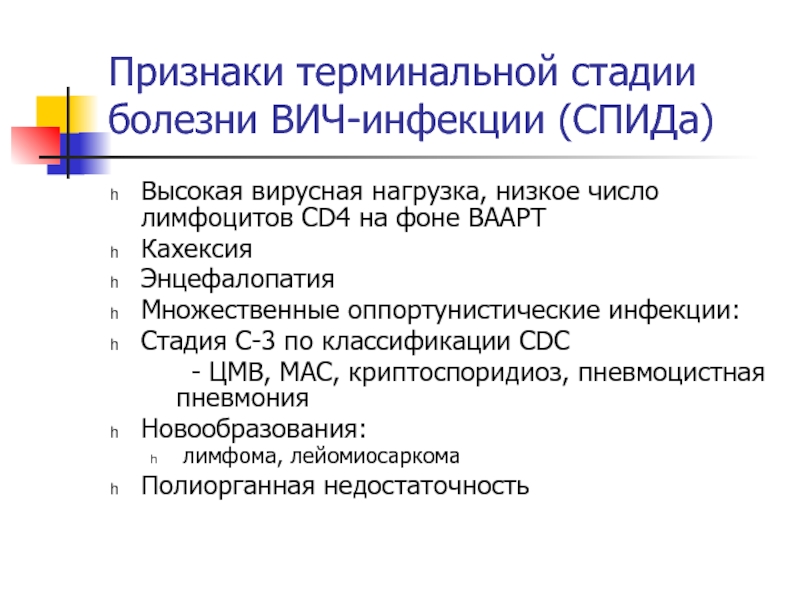 Слайд 39Признаки терминальной стадии болезни ВИЧ-инфекции (СПИДа)
