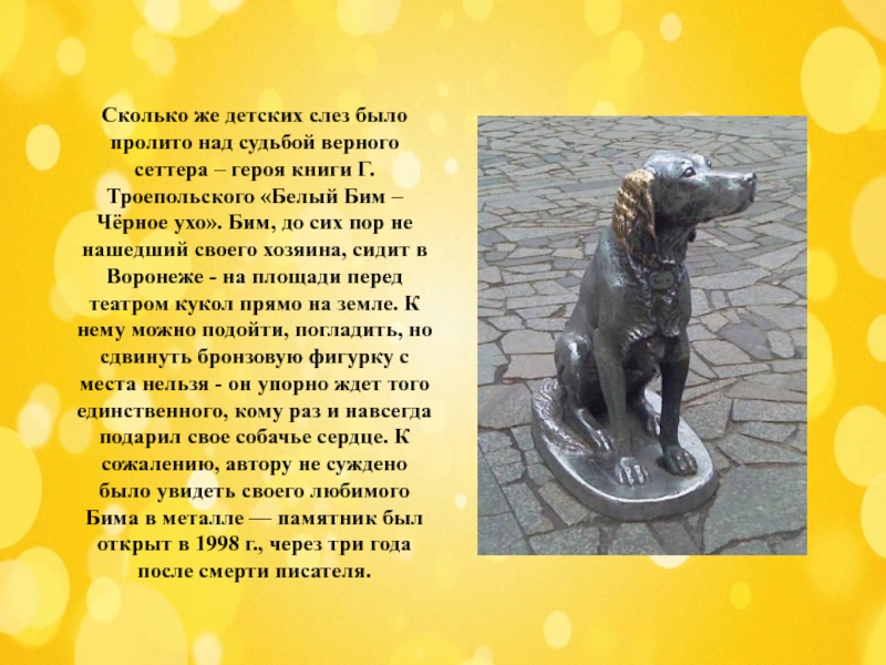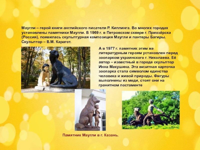 А в 1977 г. памятник этим же литературным героям установлен перед зоопарком украинского г. Николаева. Её автор – известный в городе скульптор Инна Макушина. Эта визитная карточка зоопарка стала символом единства человека и живой природы. Фигуры выполнены из меди, стоят они на гранитном постаменте