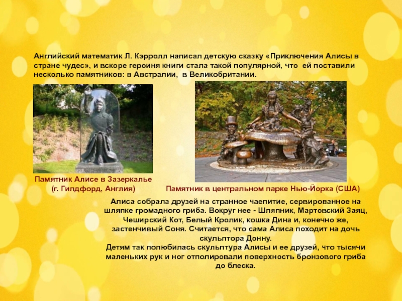 Английский математик Л. Кэрролл написал детскую сказку «Приключения Алисы в стране чудес», и вскоре героиня книги стала такой популярной, что ей поставили несколько памятников: в Австралии, в Великобритании.