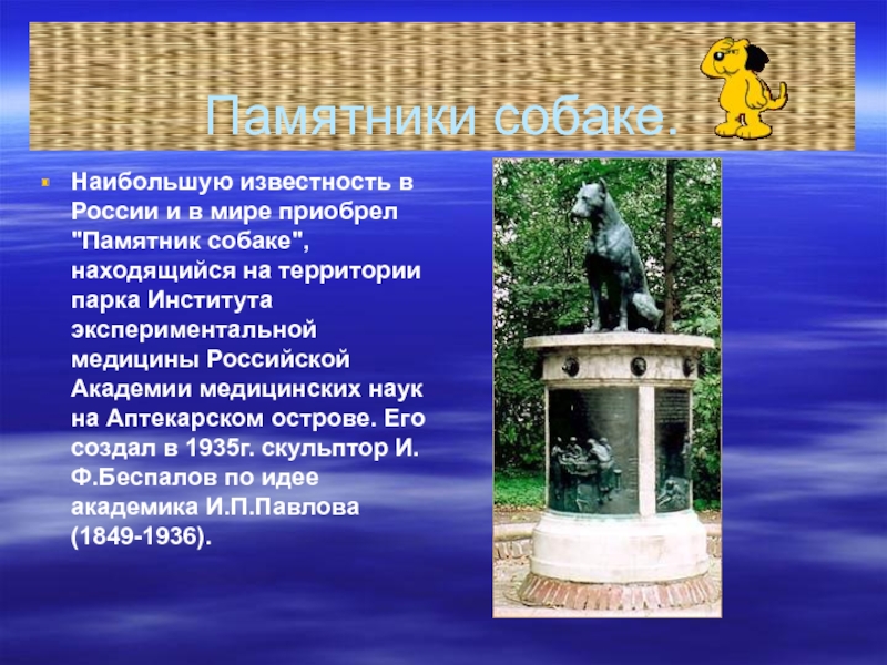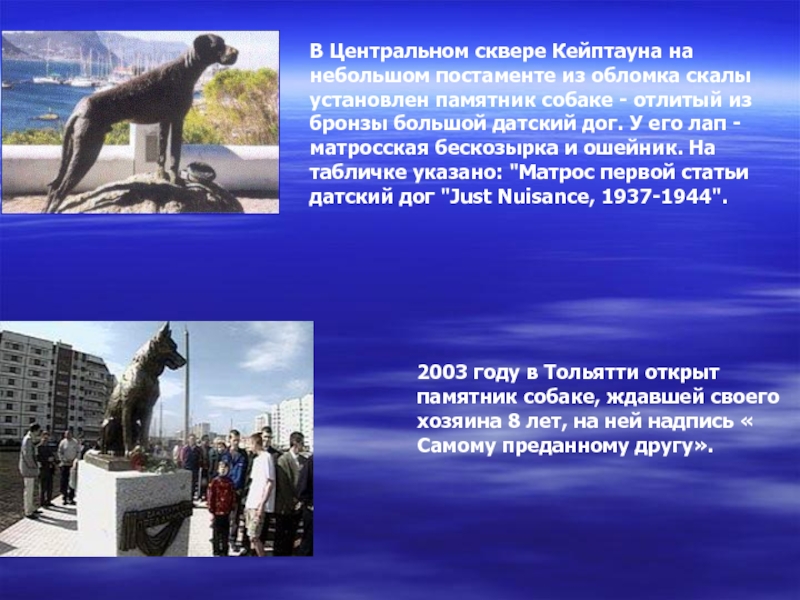 2003 году в Тольятти открыт памятник собаке, ждавшей своего хозяина 8 лет, на ней надпись « Самому преданному другу».
