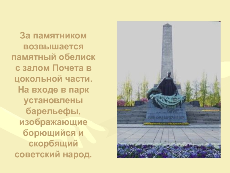 На входе в парк установлены барельефы, изображающие борющийся и скорбящий советский народ.