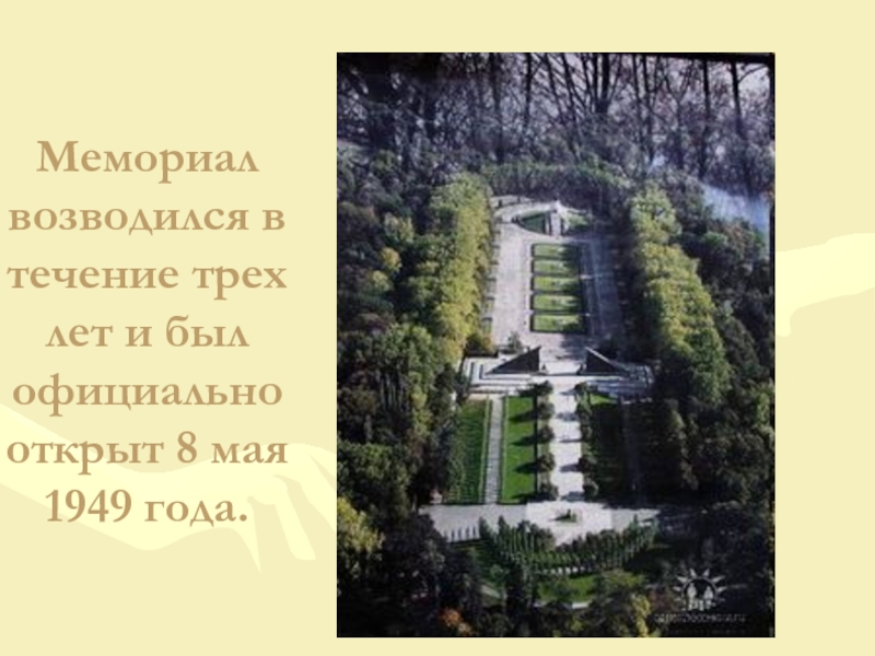 Слайд 10Мемориал возводился в течение трех лет и был официально открыт 8