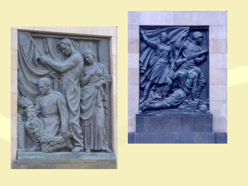 советских воинов — это фигура советского солдата, в одной руке которого — меч, разрубающий фашистскую свастику, на другой — спасенная из развалин поверженного Берлина маленькая немецкая девочка.
