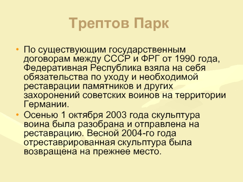 года, Федеративная Республика взяла на себя обязательства по уходу и необходимой реставрации памятников и других захоронений советских воинов на территории Германии.