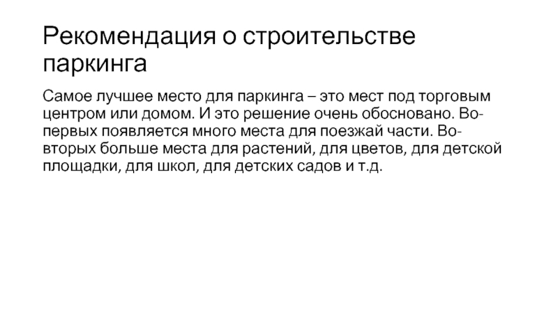 мест под торговым центром или домом. И это решение очень обосновано. Во-первых появляется много места для поезжай части. Во-вторых больше места для растений, для цветов, для детской площадки, для школ, для детских садов и т.д.
