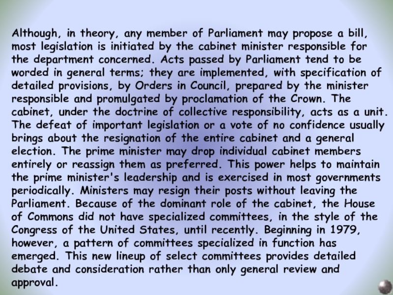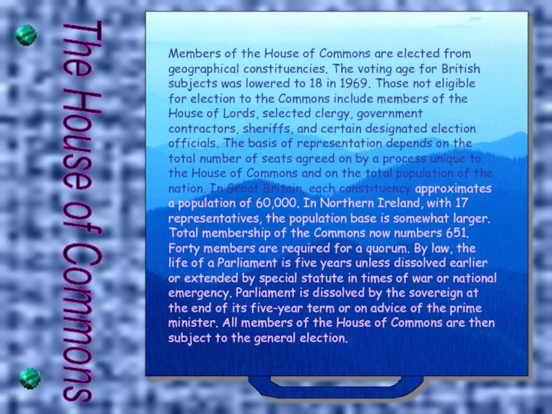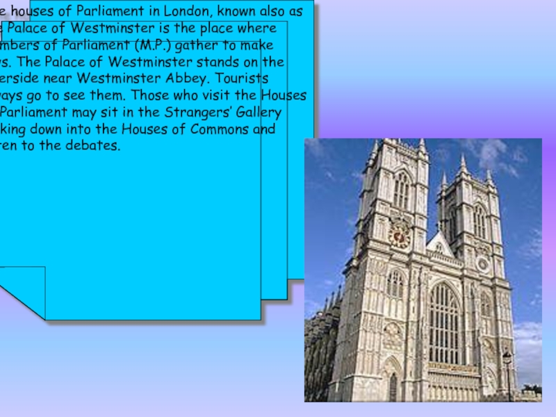 The Houses of Parliament of Westminster Palace is the place where members of Parliament gather to make laws. Sessions usually begin at the end of October and last about 160 days. All the time the Parliament on session a flag can be seen over the building. Visitors may sit at the Strangers’ Gallery and listen to the debates.