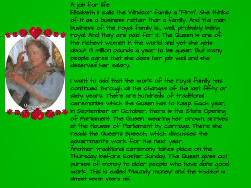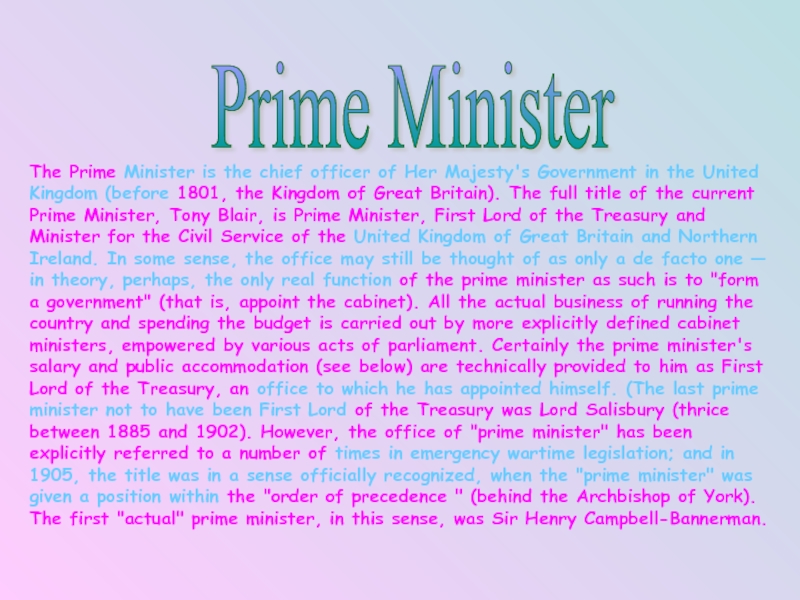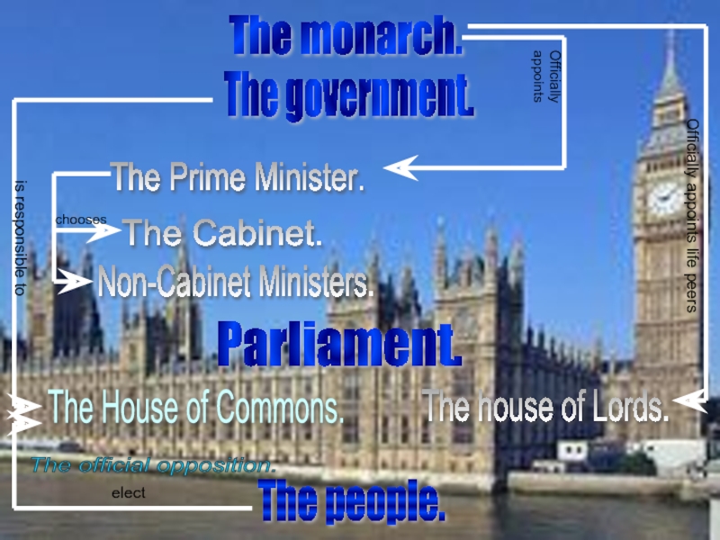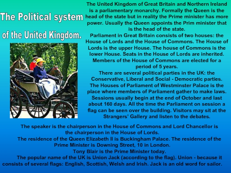 The United Kingdom of Great Britain and Northern Ireland is a parliamentary monarchy. Formally the Queen is the head of the state but in reality the Prime minister has more power. Usually the Queen appoints the Prim minister that is the head of the state.