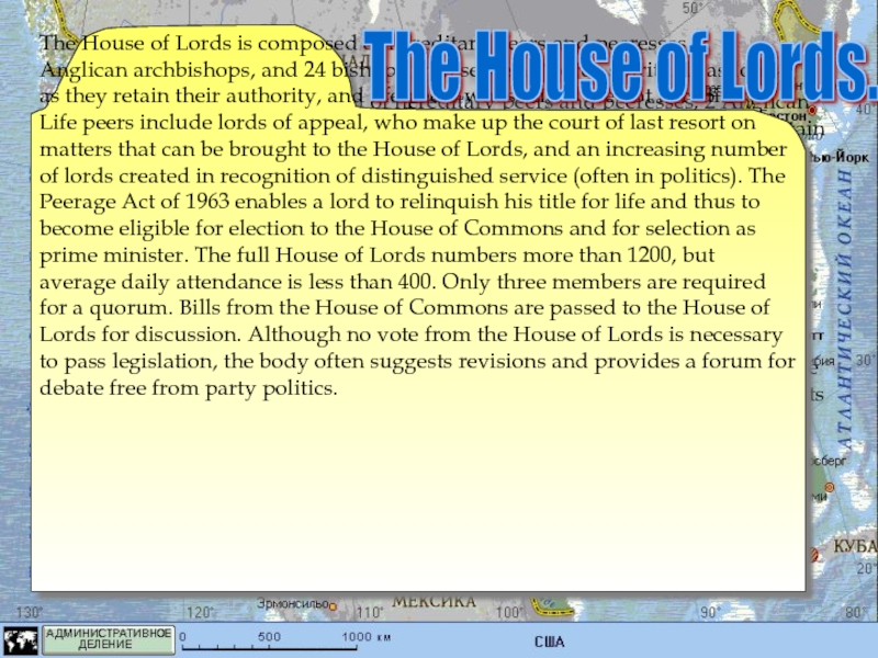 The House of Lords is composed of hereditary peers and peeresses, 2 Anglican archbishops, and 24 bishops who serve as “lords spiritual” as long as they retain their authority, and life peers whose titles are not hereditary. Life peers include lords of appeal, who make up the court of last resort on matters that can be brought to the House of Lords, and an increasing number of lords created in recognition of distinguished service (often in politics). The Peerage Act of 1963 enables a lord to relinquish his title for life and thus to become eligible for election to the House of Commons and for selection as prime minister. The full House of Lords numbers more than 1200, but average daily attendance is less than 400. Only three members are required for a quorum. Bills from the House of Commons are passed to the House of Lords for discussion. Although no vote from the House of Lords is necessary to pass legislation, the body often suggests revisions and provides a forum for debate free from party politics.
