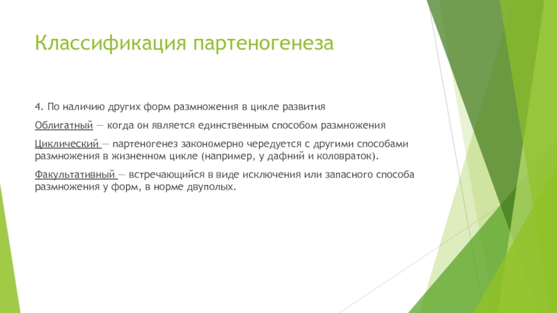 Циклический — партеногенез закономерно чередуется с другими способами размножения в жизненном цикле (например, у дафний и коловраток).