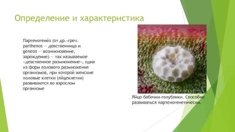 возникновение, зарождение) — так называемое «девственное размножение», одна из форм полового размножения организмов, при которой женские половые клетки (яйцеклетки) развиваются во взрослом организме без оплодотворения.