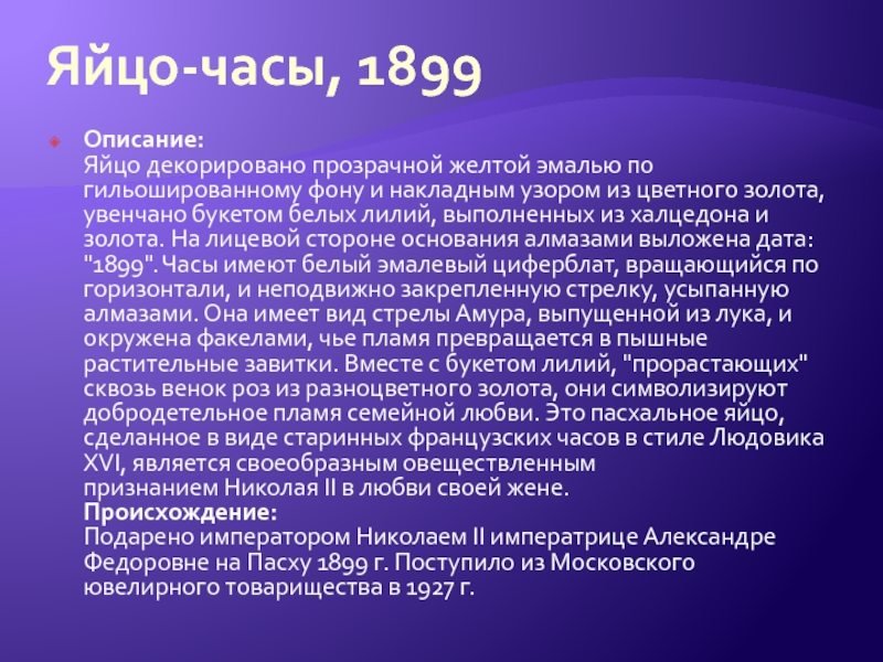 узором из цветного золота, увенчано букетом белых лилий, выполненных из халцедона и золота. На лицевой стороне основания алмазами выложена дата: "1899". Часы имеют белый эмалевый циферблат, вращающийся по горизонтали, и неподвижно закрепленную стрелку, усыпанную алмазами. Она имеет вид стрелы Амура, выпущенной из лука, и окружена факелами, чье пламя превращается в пышные растительные завитки. Вместе с букетом лилий, "прорастающих" сквозь венок роз из разноцветного золота, они символизируют добродетельное пламя семейной любви. Это пасхальное яйцо, сделанное в виде старинных французских часов в стиле Людовика XVI, является своеобразным овеществленным признанием Николая II в любви своей жене.