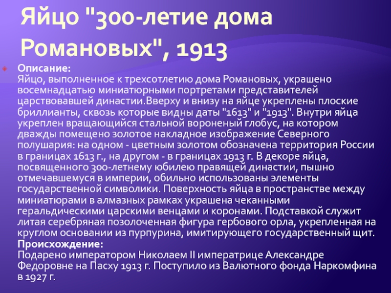 восемнадцатью миниатюрными портретами представителей царствовавшей династии.Вверху и внизу на яйце укреплены плоские бриллианты, сквозь которые видны даты "1613" и "1913". Внутри яйца укреплен вращающийся стальной вороненый глобус, на котором дважды помещено золотое накладное изображение Северного полушария: на одном - цветным золотом обозначена территория России в границах 1613 г., на другом - в границах 1913 г. В декоре яйца, посвященного 300-летнему юбилею правящей династии, пышно отмечавшемуся в империи, обильно использованы элементы государственной символики. Поверхность яйца в пространстве между миниатюрами в алмазных рамках украшена чеканными геральдическими царскими венцами и коронами. Подставкой служит литая серебряная позолоченная фигура гербового орла, укрепленная на круглом основании из пурпурина, имитирующего государственный щит.