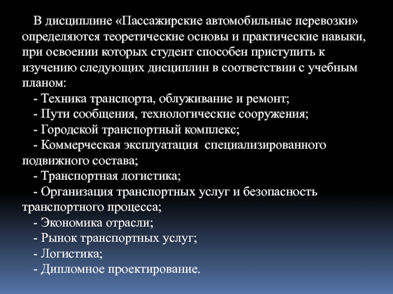 Слайд 5В дисциплине «Пассажирские автомобильные перевозки» определяются теоретические основы и практические навыки,