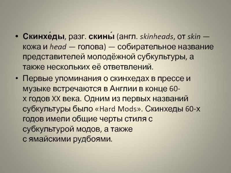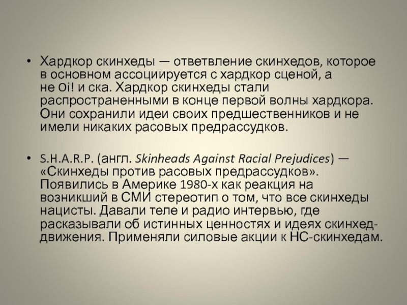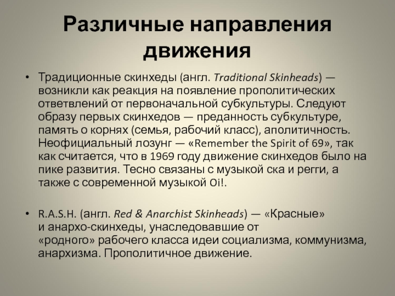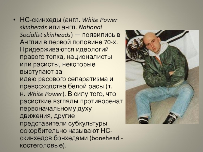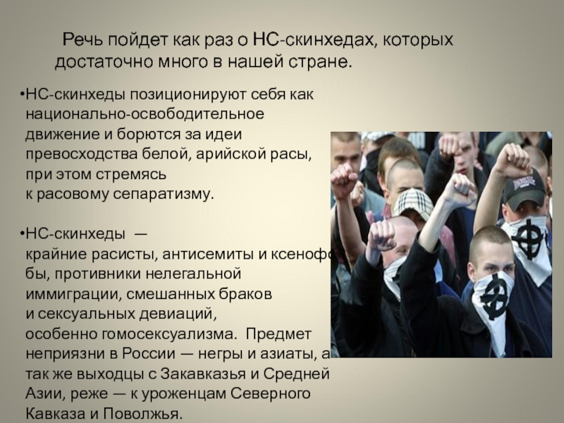 НС-скинхеды — крайние расисты, антисемиты и ксенофобы, противники нелегальной иммиграции, смешанных браков и сексуальных девиаций, особенно гомосексуализма. Предмет неприязни в России — негры и азиаты, а так же выходцы с Закавказья и Средней Азии, реже — к уроженцам Северного Кавказа и Поволжья.