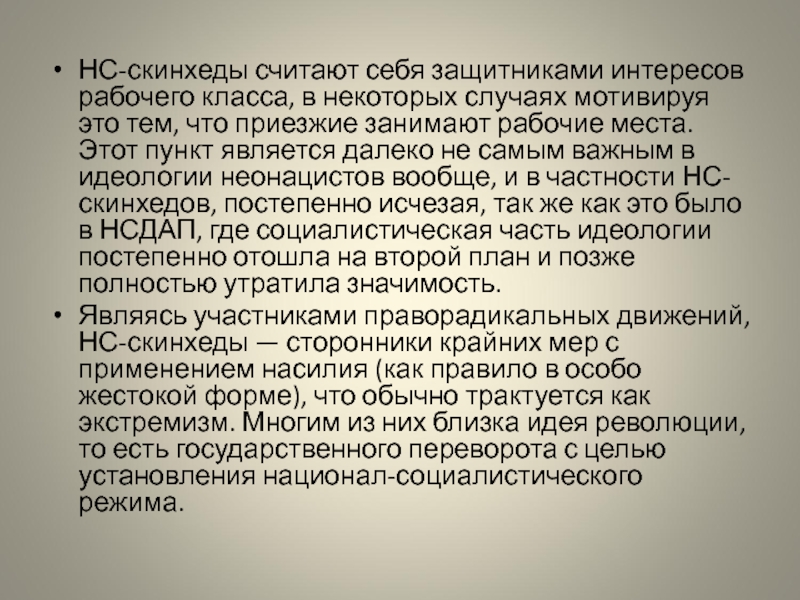 НС-скинхеды позиционируют себя как национально-освободительное движение и борются за идеи превосходства белой, арийской расы, при этом стремясь к расовому сепаратизму.
