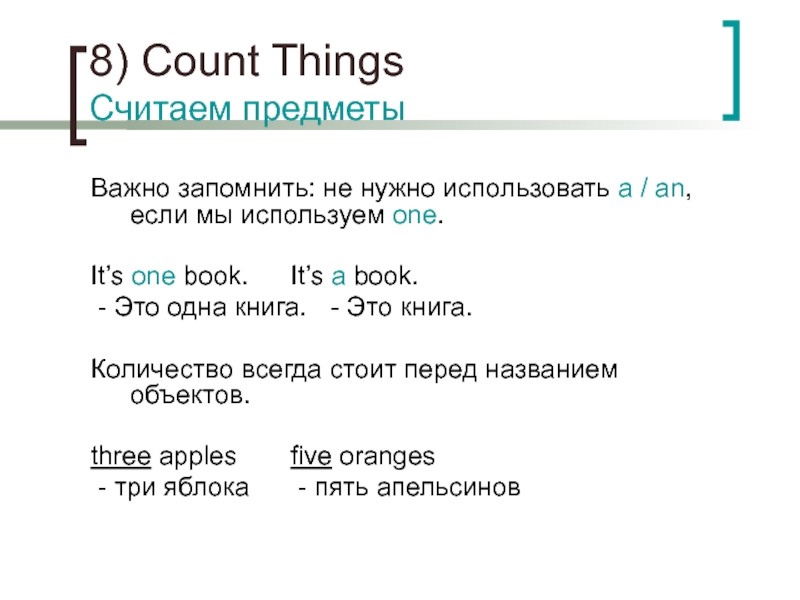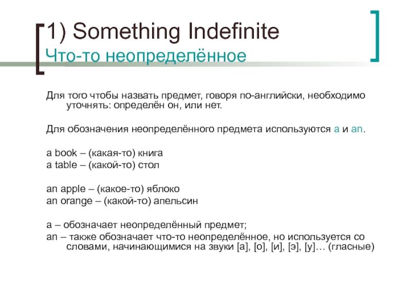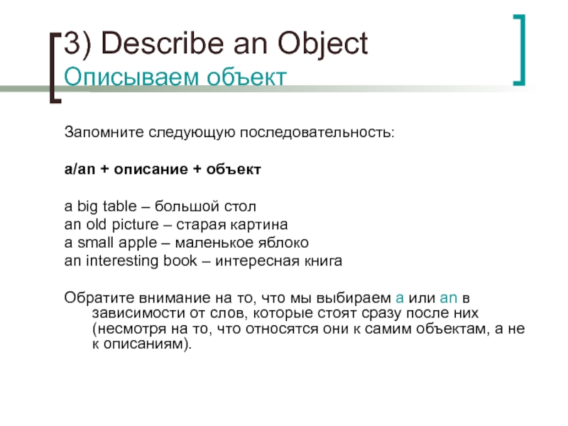 Обратите внимание на то, что мы выбираем a или an в зависимости от слов, которые стоят сразу после них (несмотря на то, что относятся они к самим объектам, а не к описаниям).