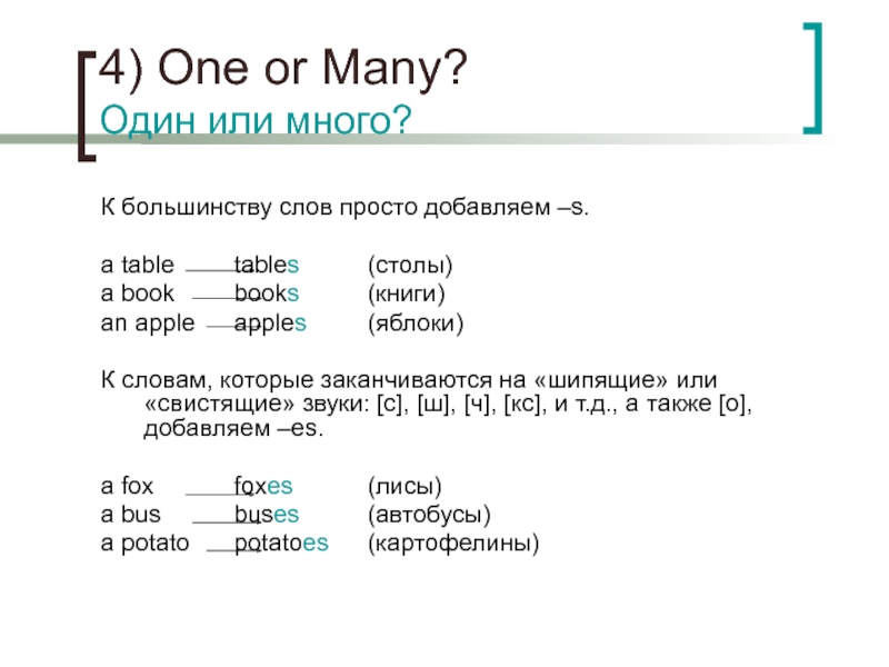 К словам, которые заканчиваются на «шипящие» или «свистящие» звуки: [с], [ш], [ч], [кс], и т.д., а также [о], добавляем –es.