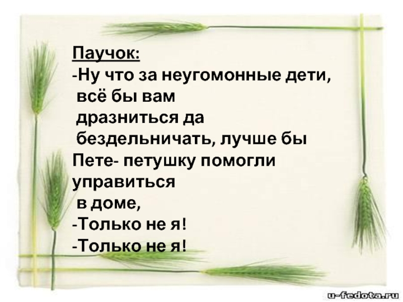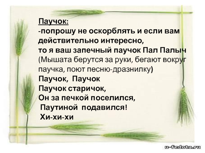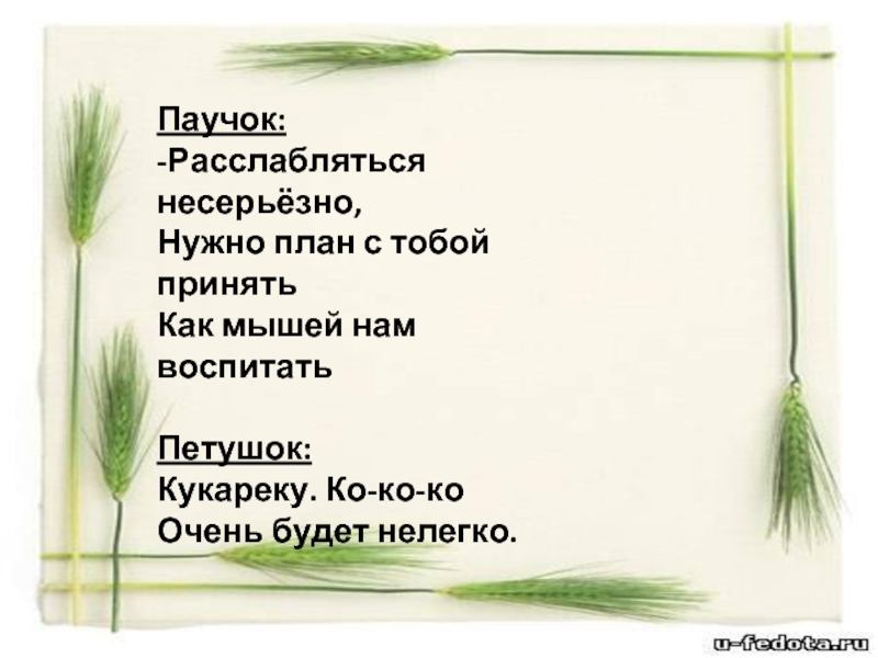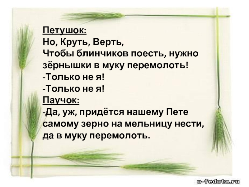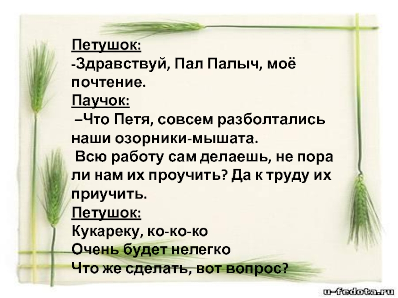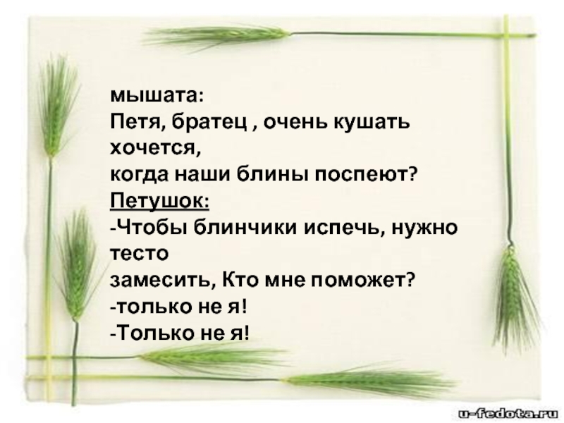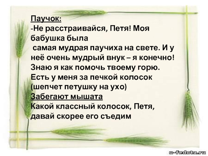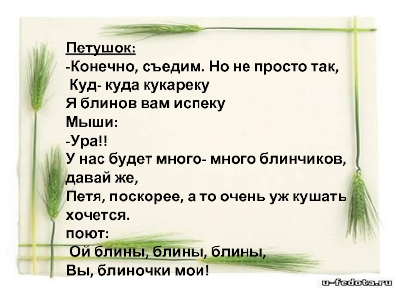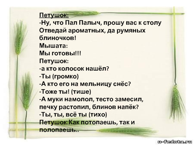 Есть у меня за печкой колосок (шепчет петушку на ухо)