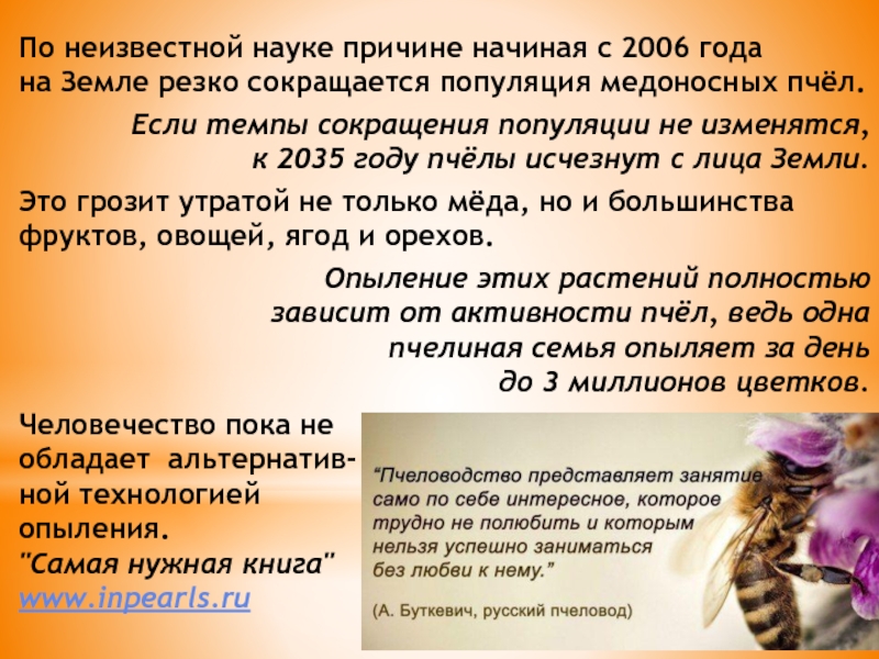 Слайд 16По неизвестной науке причине начиная с 2006 года на Земле резко сокращается популяция медоносных