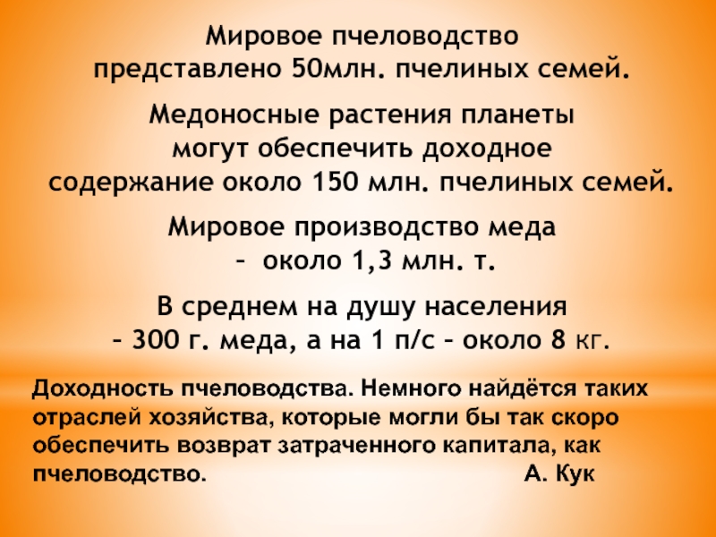 обеспечить возврат затраченного капитала, как пчеловодство. А. Кук