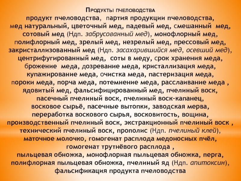 технический пчелиный воск, прополис (Ндп. пчелиный клей), маточное молочко, гомогенат расплода медоносных пчёл,