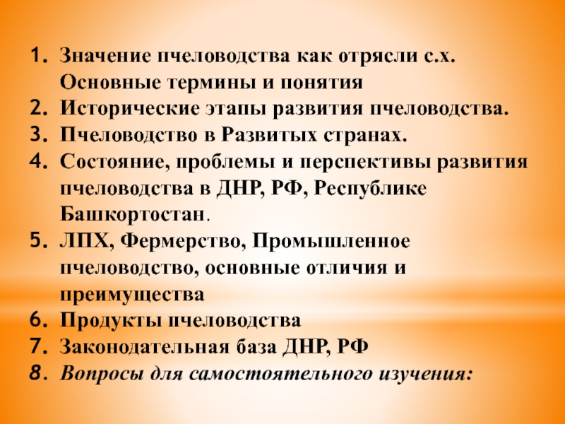 Слайд 2Значение пчеловодства как отрясли с.х. Основные термины и понятия