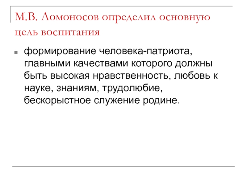 Слайд 8М.В. Ломоносов определил основную цель воспитания
