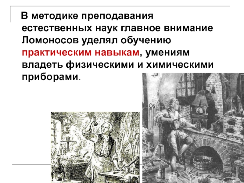 Слайд 20 В методике преподавания естественных наук главное внимание Ломоносов уделял