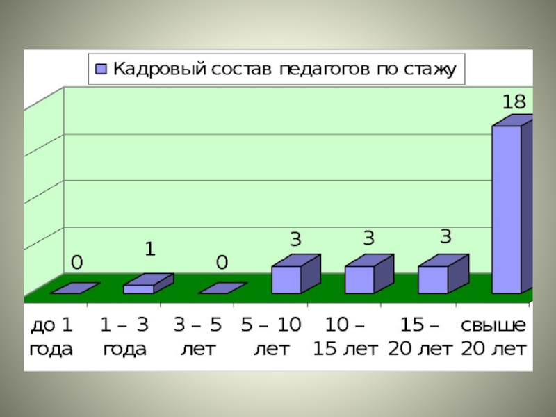 64 % педагогов имеют стаж работы свыше 20 лет, с каждым годом это число увеличивается, это говорит о том, что коллектив учителей стабильный, опытный.