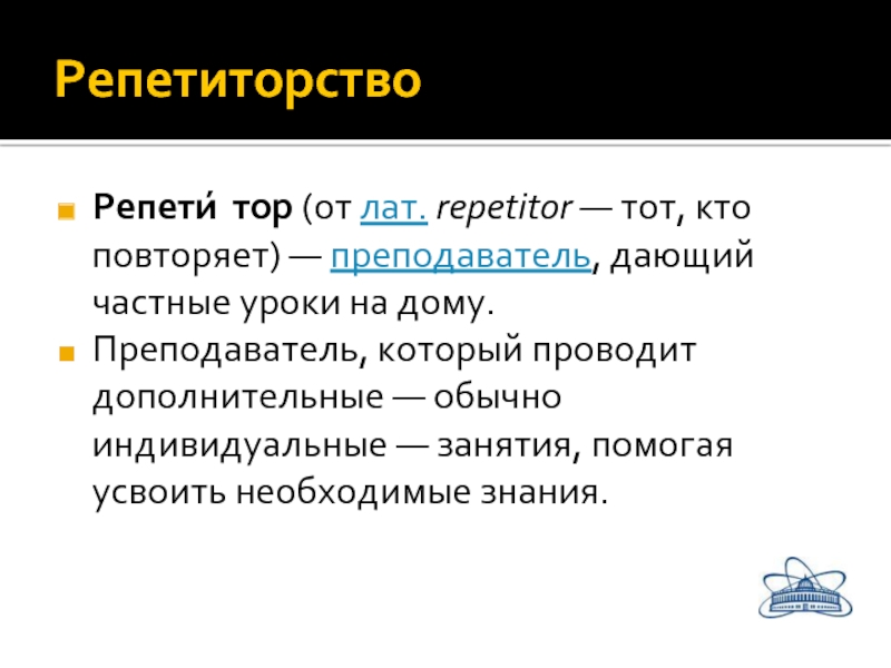 Репети́тор (от лат. repetitor — тот, кто повторяет) — преподаватель, дающий частные уроки на