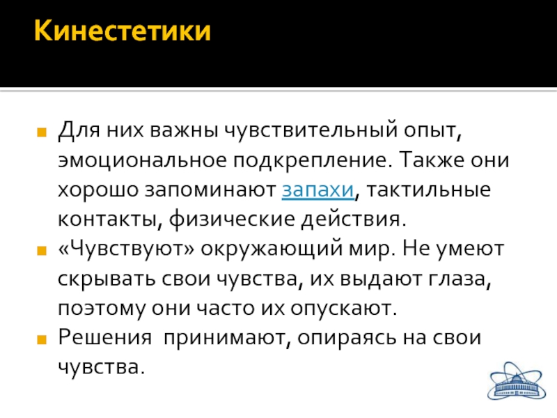 Для них важны чувствительный опыт, эмоциональное подкрепление. Также они хорошо запоминают