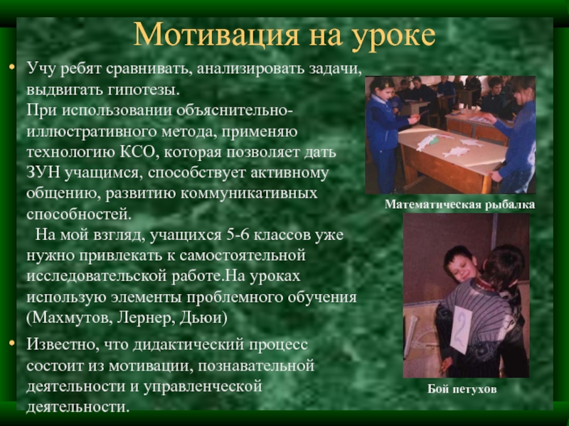 раскрыть потенциальные возможности ученика, сформировать потребность получения знаний,стараюсь постоянно совершенствовать свой педагогический уровень.Использую в работе:
