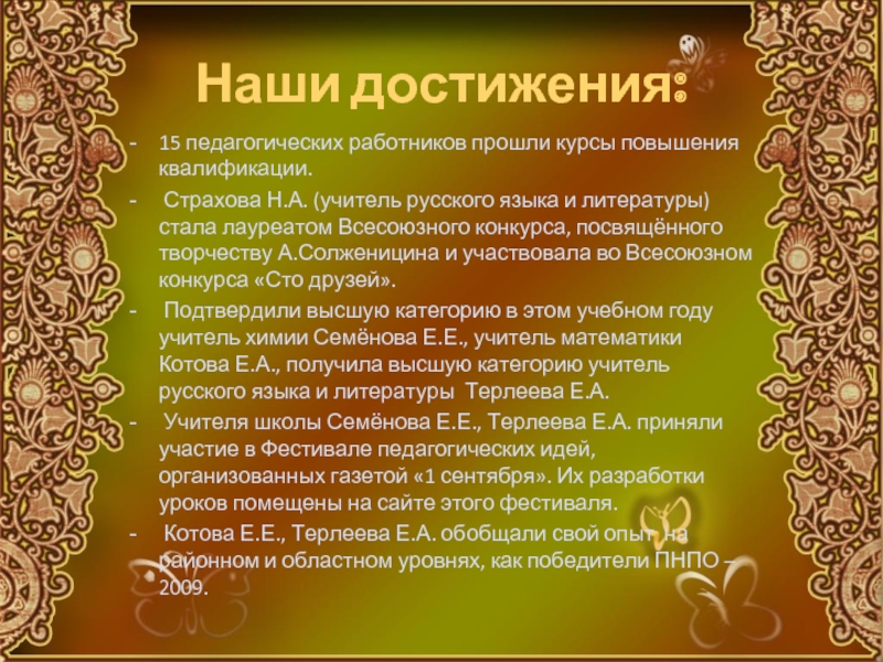 русского языка и литературы) стала лауреатом Всесоюзного конкурса, посвящённого творчеству А.Солженицина и участвовала во Всесоюзном конкурса «Сто друзей».