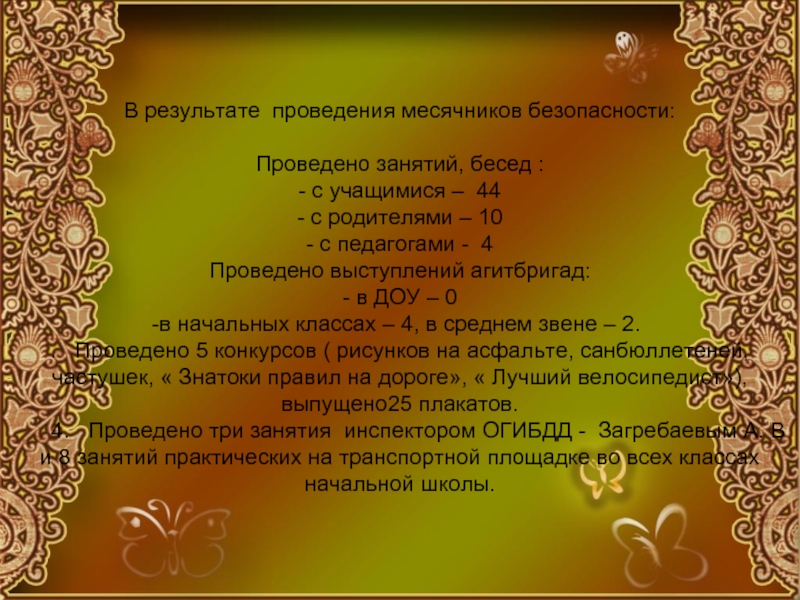 . Проведено 5 конкурсов ( рисунков на асфальте, санбюллетеней, частушек, « Знатоки правил на дороге», « Лучший велосипедист»), выпущено25 плакатов.
