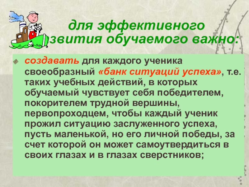 успеха», т.е. таких учебных действий, в которых обучаемый чувствует себя победителем, покорителем трудной вершины, первопроходцем, чтобы каждый ученик прожил ситуацию заслуженного успеха, пусть маленькой, но его личной победы, за счет которой он может самоутвердиться в своих глазах и в глазах сверстников;