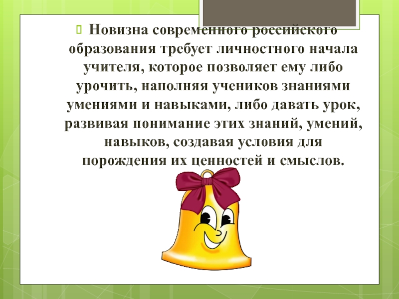 Слайд 25Новизна современного российского образования требует личностного начала учителя, которое позволяет ему