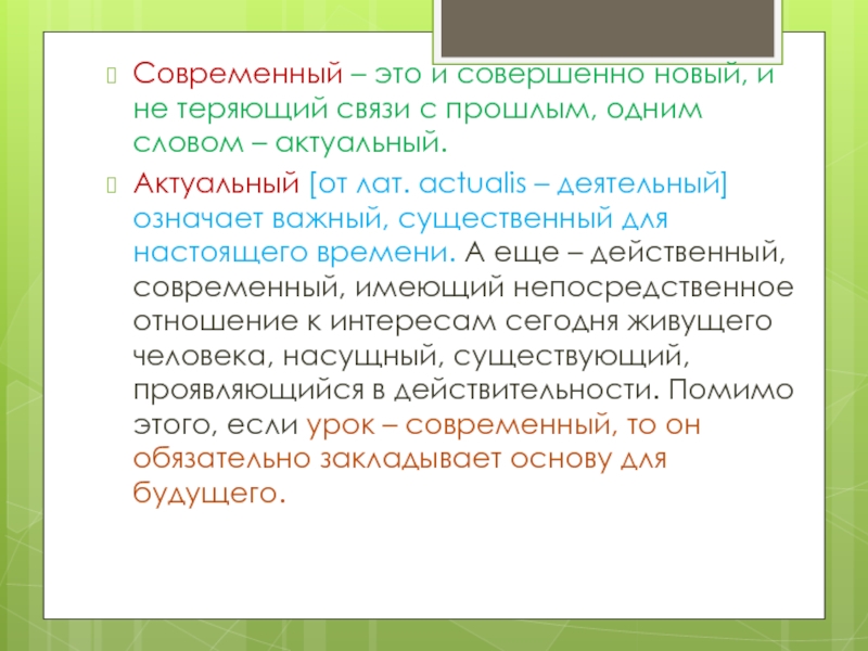 Актуальный [от лат. actualis – деятельный] означает важный, существенный для настоящего времени. А еще – действенный, современный, имеющий непосредственное отношение к интересам сегодня живущего человека, насущный, существующий, проявляющийся в действительности. Помимо этого, если урок – современный, то он обязательно закладывает основу для будущего.