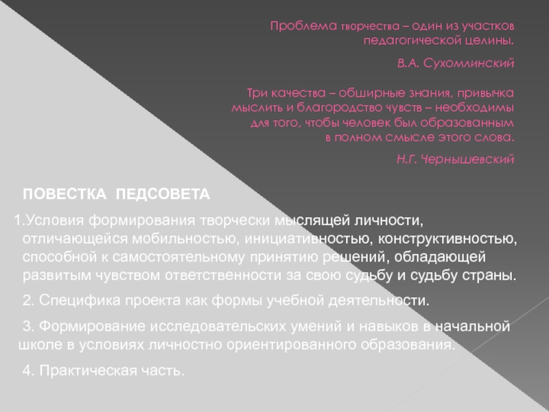 Условия формирования творчески мыслящей личности, отличающейся мобильностью, инициативностью, конструктивностью, способной к самостоятельному принятию решений, обладающей развитым чувством ответственности за свою судьбу и судьбу страны.
