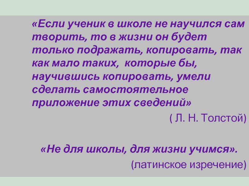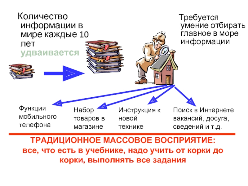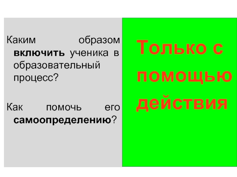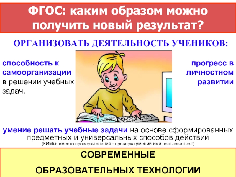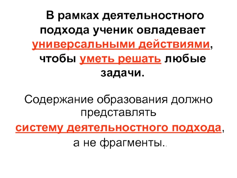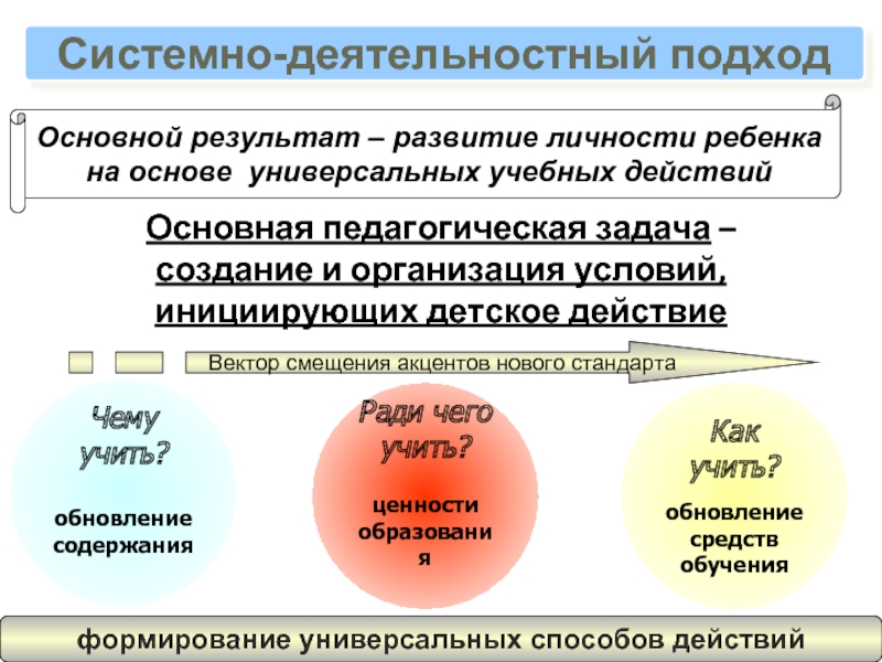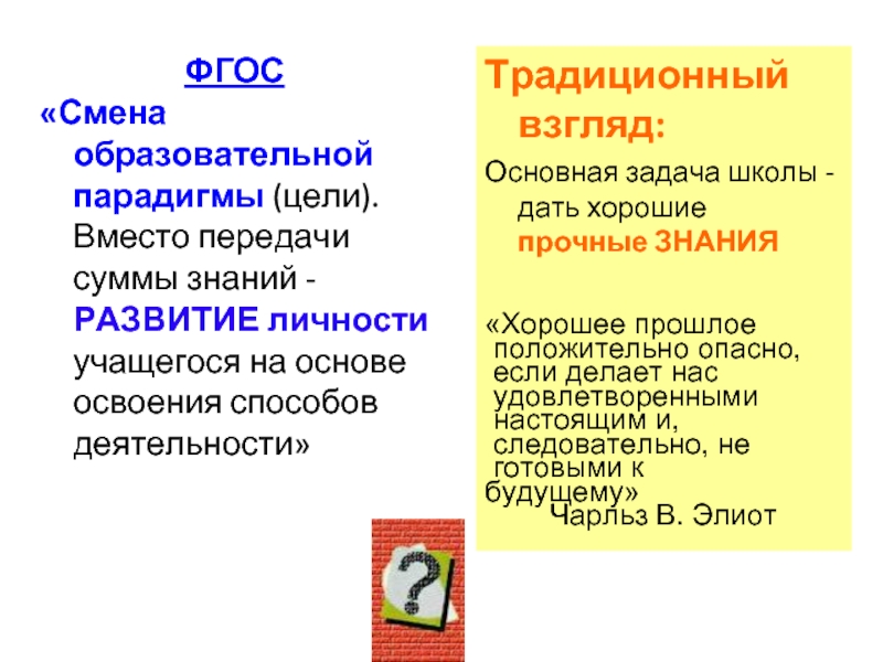 «Смена образовательной парадигмы (цели). Вместо передачи суммы знаний - РАЗВИТИЕ личности учащегося на основе освоения способов деятельности»