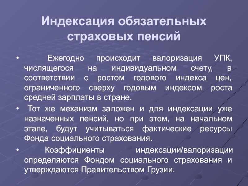 Коэффициенты индексации/валоризации определяются Фондом социального страхования и утверждаются Правительством Грузии.