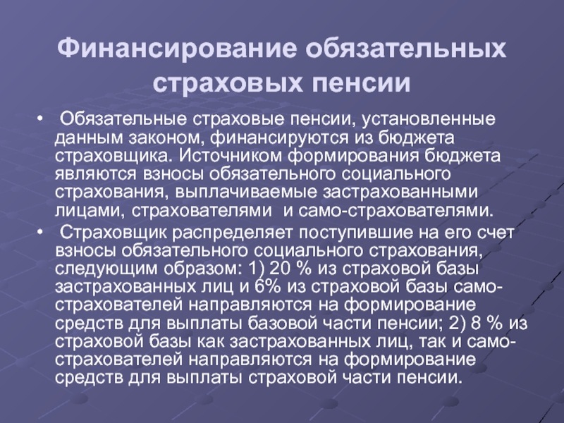 Страховщик распределяет поступившие на его счет взносы обязательного социального страхования, следующим образом: 1) 20 % из страховой базы застрахованных лиц и 6% из страховой базы само-страхователей направляются на формирование средств для выплаты базовой части пенсии; 2) 8 % из страховой базы как застрахованных лиц, так и само-страхователей направляются на формирование средств для выплаты страховой части пенсии.