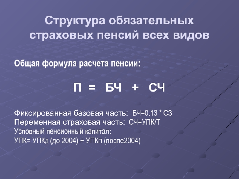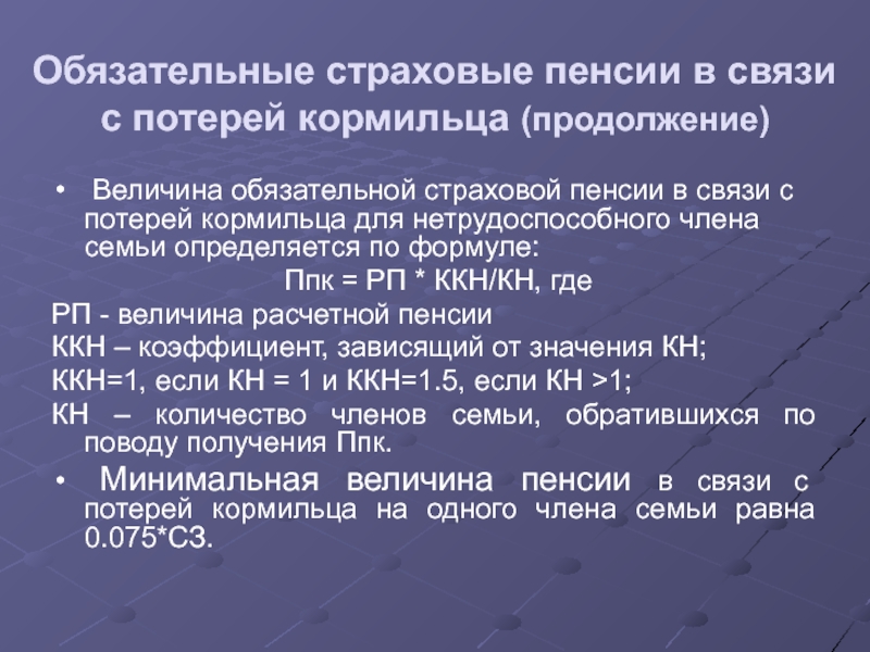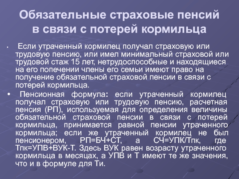Пенсионная формула: если утраченный кормилец получал страховую или трудовую пенсию, расчетная пенсия (РП), используемая для определения величины обязательной страховой пенсии в связи с потерей кормильца, принимается равной пенсии утраченного кормильца; если же утраченный кормилец не был пенсионером, РП=БЧ+СТ, а СЧ=УПК/Тпк, где Тпк=УПВ+ВУК-Т. Здесь ВУК равен возрасту утраченного кормильца в месяцах, а УПВ и Т имеют те же значения, что и в формуле для Ти.