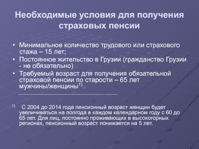 1) С 2004 до 2014 года пенсионный возраст женщин будет увеличиваться на полгода в каждом календарном году с 60 до 65 лет. Для лиц, постоянно проживающих в высокогорных регионах, пенсионный возраст понижается на 5 лет.