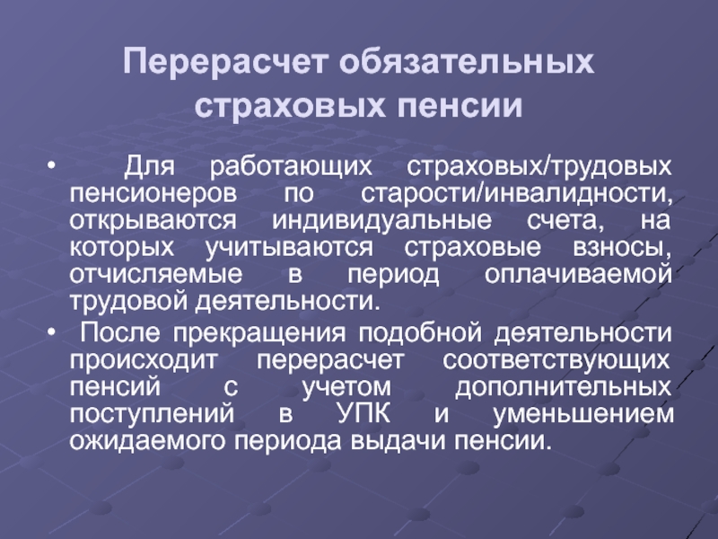 После прекращения подобной деятельности происходит перерасчет соответствующих пенсий с учетом дополнительных поступлений в УПК и уменьшением ожидаемого периода выдачи пенсии.