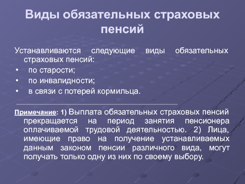 Примечание: 1) Выплата обязательных страховых пенсий прекращается на период занятия пенсионера оплачиваемой трудовой деятельностью. 2) Лица, имеющие право на получение устанавливаемых данным законом пенсии различного вида, могут получать только одну из них по своему выбору.