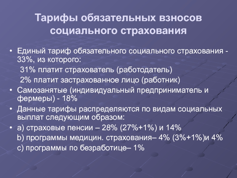 Данные тарифы распределяются по видам социальных выплат следующим образом: