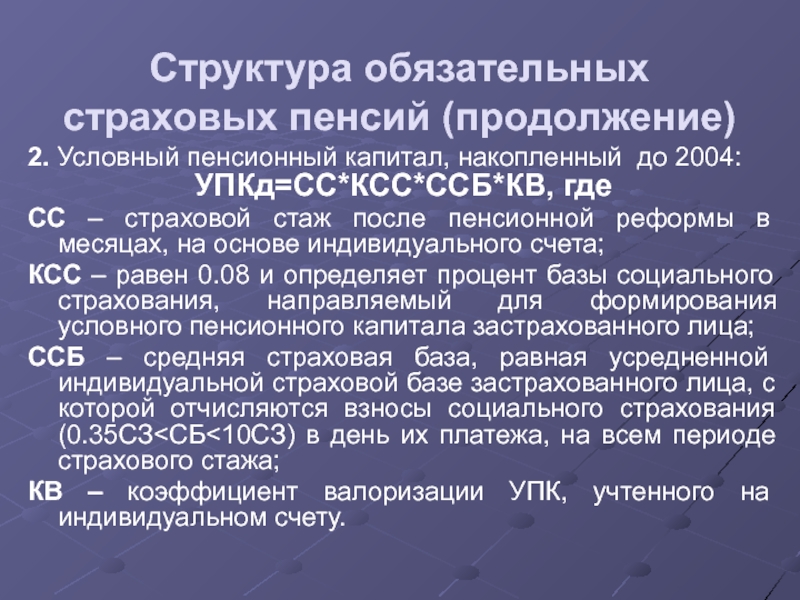 КСС – равен 0.08 и определяет процент базы социального страхования, направляемый для формирования условного пенсионного капитала застрахованного лица;