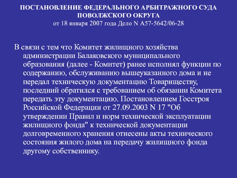 Комитет жилищного хозяйства администрации Балаковского муниципального образования (далее - Комитет) ранее исполнял функции по содержанию, обслуживанию вышеуказанного дома и не передал техническую документацию Товариществу, последний обратился с требованием об обязании Комитета передать эту документацию. Постановлением Госстроя Российской Федерации от 27.09.2003 N 17 "Об утверждении Правил и норм технической эксплуатации жилищного фонда" к технической документации долговременного хранения отнесены акты технического состояния жилого дома на передачу жилищного фонда другому собственнику.